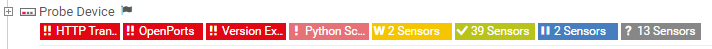 In the classic device tree view, you can collapse devices, groups, and probes. Click left of the object name to summarize the sensors according to their respective status. By default, sensors in the Down, Down (Partial), or Down (Acknowledged) status are summarized if there are more than ten sensors with the same status, otherwise they are displayed individually.