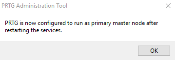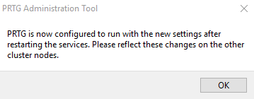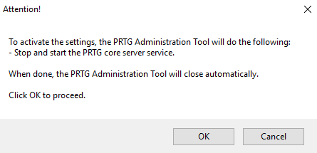 A dialog box appears where PRTG asks you to agree to restart the PRTG core server service. Click OK to proceed.