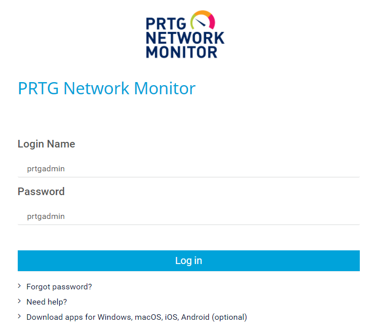 PRTG automatically fills in the credentials of the predefined PRTG System Administrator user. The login name and the initial password is prtgadmin. Click Log in to proceed.